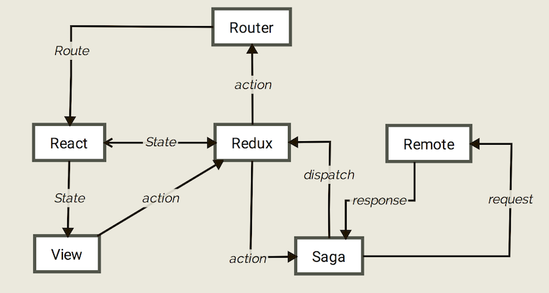 可以看到,贯穿其中最多的便是action和state,而redux显然是整个项目连接起来的枢纽,saga则是用于封装了所有的异步网络请求(_封装成更加业务化的任务_)。这里举一条比较常见的流程:用户从界面上点击了某个按钮,然后发送了网络请求,以及请求响应后对界面的更新: