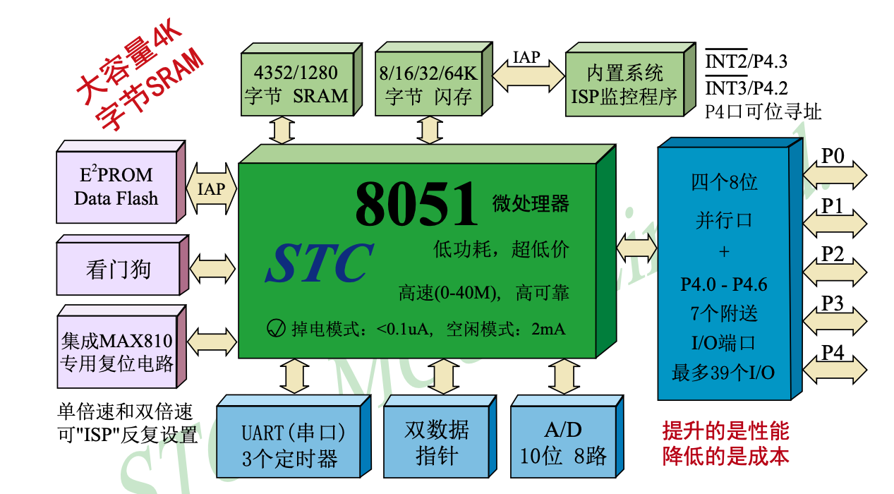- ISP(在系统可编程)/IAP(在应用可编程),无需专用编程器,无需专用仿真器可通过串口 (RxD/P3.0,TxD/P3.1) 直接下载用户程序,数秒即可完成一片
