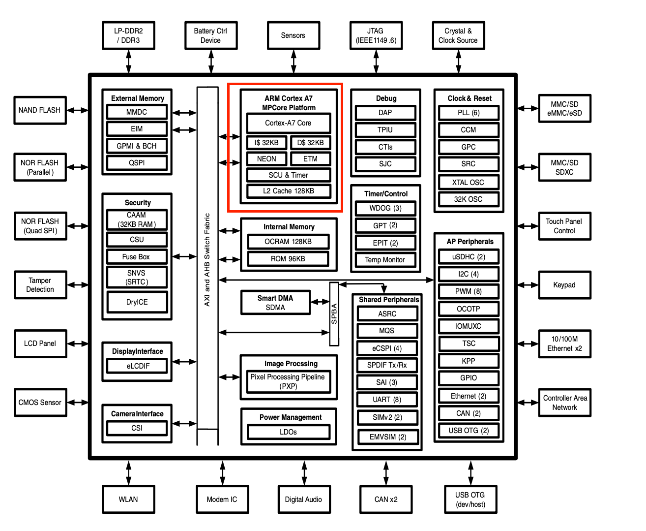 前面讲了 MPU、MCU 这种微芯片,这里又要引出来另外一个概念叫 SoC,SoC 是什么呢?SoC 的全称是片上系统 (System on Chip)。这里我以大家比较熟知的 ARM 处理器来举例,大家有没有想过,很多手机或平板都在号称自己使用的是 ARM 处理器,但同样是 ARM 处理器,为什么会有高通、三星、苹果等等品牌的区别呢?比如高通的骁龙、三星的 Exynos。 这就要将处理器再细分一下了,ARM 公司其实并不实际生产处理器,而是提供处理器的架构设计方案,各个厂商 (比如高通或者三星) 拿到 ARM 公司的设计以及版权后,就可以开始自己的处理器设计,这里的设计并不是对 ARM 的设计进行修改 (应该也是版权不允许的),而是使用 ARM 架构所预留的接口(或者称之为地址空间)来扩展芯片上的外围设备 (简称芯片外设),比如加一些控制单元、处理单元等等。这就是片上系统,片上系统所能拓展的外设也很多,比如:GPIO、UART(串口)、I2C、I2S、SPI 等等,这些都称之为芯片的外设(Peripheral),下图是恩智浦的一款处理器片上系统框图: