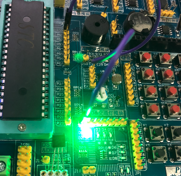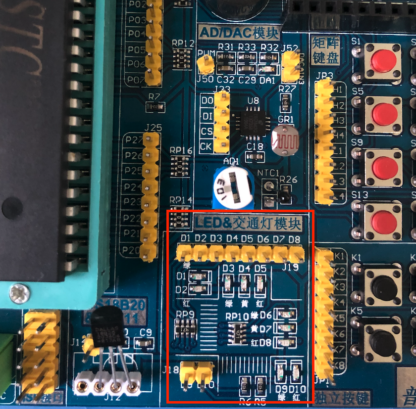 可以看到,这里有好多的灯,并且摆放的很像人行道旁边的红绿灯,我们可以用程序来模拟红绿灯变化情况,不过,这不在本篇的范畴,本篇我们只要点亮一盏灯即可!