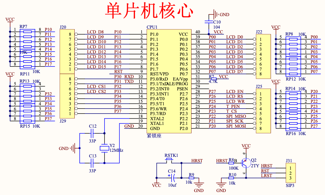 - 晶振电路: 这个并不一定是必须的,有些芯片需要外接晶振提供时钟源才需要 (比如我们今天的这个 STC89C51)