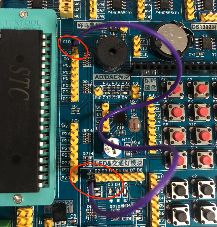 这里包括后续使用到的所有开发板,为了避免推销嫌疑,都不会给出购买链接的,我们把注意力集中在点灯上。上图中间那黑色的一条就是 STC89C51 的本尊了,其它都是一些板级外设。这块开发板有一个特点,所有外设都不是直接与 MCU 连接的,而是 MCU 引脚连接到了排针上 (或者叫端子),外设的引脚也是连接到排针上,所以我们需要使用额外的导线将需要的外设与 MCU 对应的引脚通过排针进行连接,这种设计就比较灵活,我们甚至可以通过导线连接到本身不在开发板上的设备。下图是今天我们需要点亮的 LED 灯所在区域: