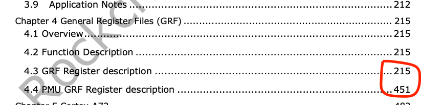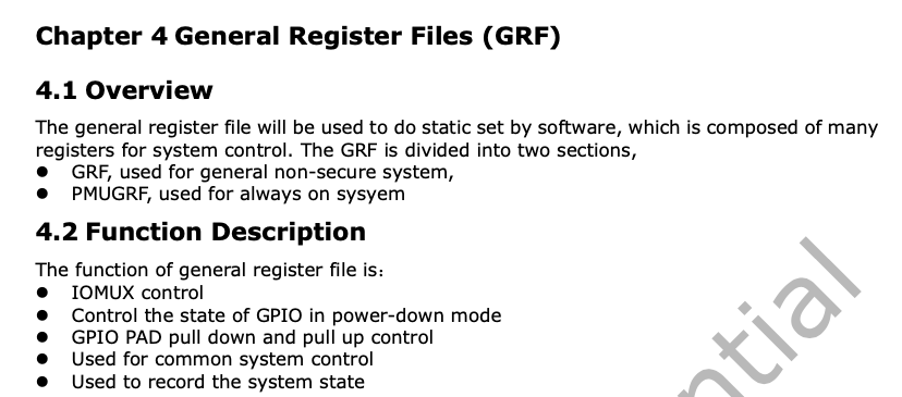 首先我们要了解清楚的是,什么是寄存器?如果你只做过传统的应用开发,那你了解到的寄存器概念可能是狭义的,传统意义里的寄存器大多是指处理器核心里的寄存器,可以称之为 CPU 寄存器,比如 ARM 的通用寄存器 r0、r1、r2…,Intel 的 eax、ebx、ecx…。前面说过了,SoC 厂商在拿到这些处理器核心后,会开始构建片上系统,也就是基于处理器核心来增加一些额外的处理或控制单元 (比如 GPIO),那 SoC 的用户怎么使用这些单元呢?也是通过寄存器,SoC 厂商会将这些单元的配置和使用都定义成一系列的寄存器,这就是广义上的寄存器,可以称之为片外寄存器 (片外是相对于处理器核心而言)。因为片外系统需要适应广泛的使用场景,所以一般模块种类和配置方式都很多,因此,SoC 厂商在提供芯片的同时,也会提供对于片外寄存器进行配置使用的描述手册,大多数情况下都会放在数据手册里 (datasheet),也有直接提供寄存器手册的。这些描述会占据手册的大部分类型,以下是瑞芯微的一款芯片数据手册对于 GPIO 相关寄存器的描述: