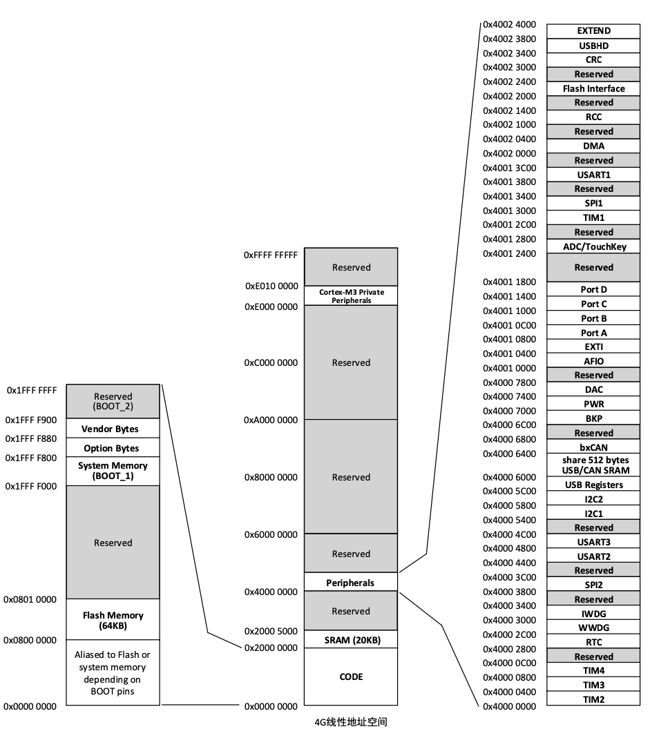从图中可以看到,这是一个 32 位的地址空间,外设的地址空间是: 0x4000 0000 - 0x4002 4000;一共有 4 组 GPIO 接口:PortA - PortD,地址空间是: 0x4001 0800 - 0x4001 1800。另外可以看出,作为一个 MCU,很多地址空间都是没有被使用,因为本身的能力决定了它使用不完。这里又无意间引出了另外一个概念: 32 位地址空间 (坑越挖越多呀,感觉今天的灯还要再点一会儿)。